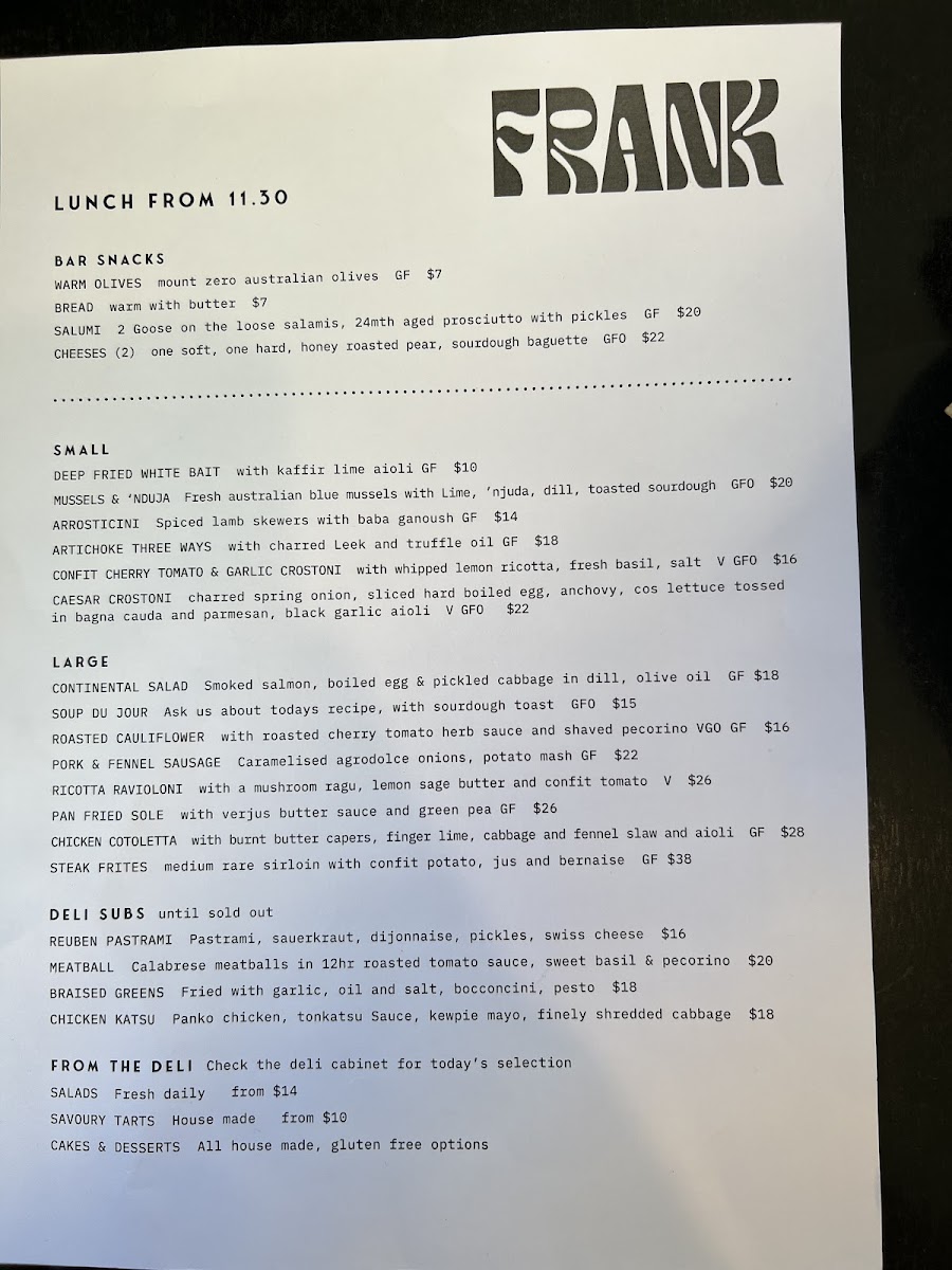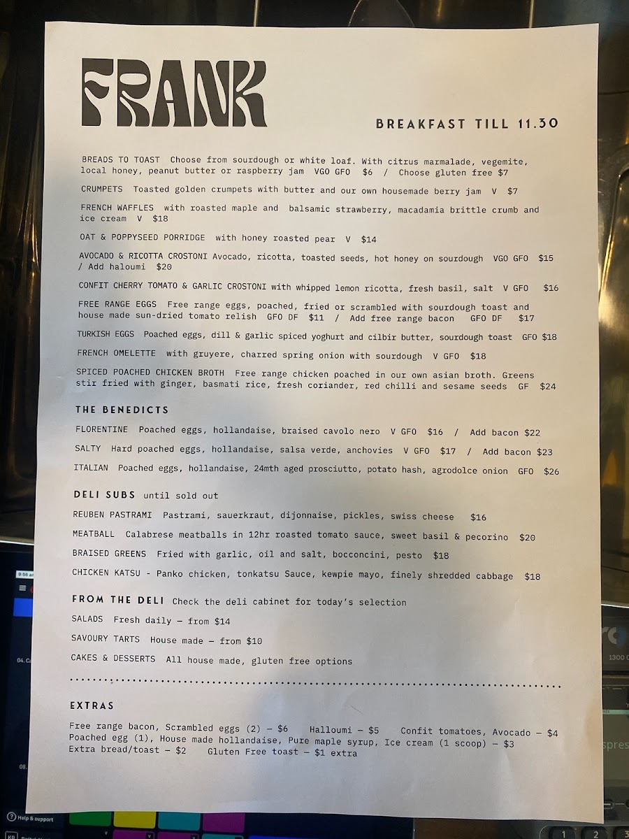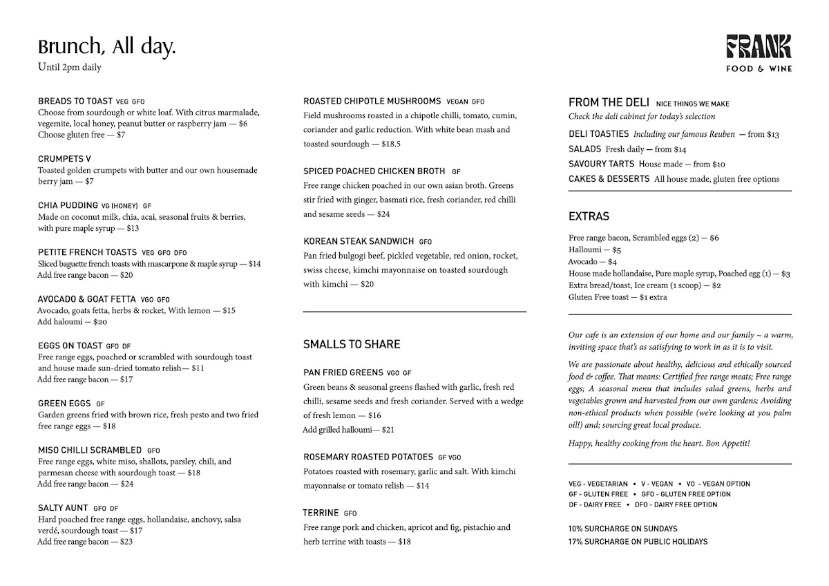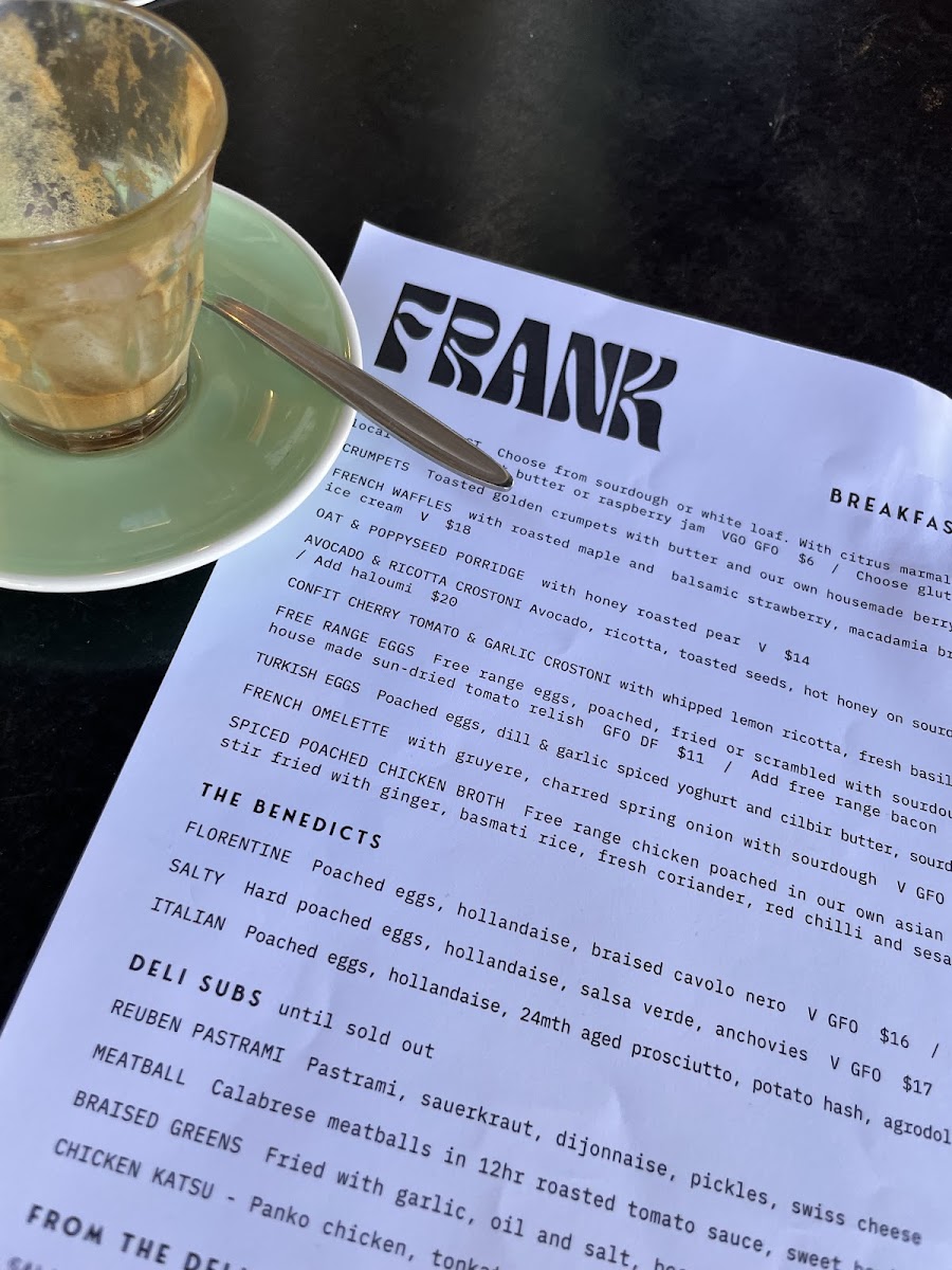 The menu at Frank Food & Wine offers a delightful mix of dishes perfect for any time of day, whether it's breakfast, brunch, or something in between. For breakfast, you can indulge in treats like French Waffles with Roasted Maple and Balsamic Strawberry, served with Macadamia Brittle Crumb and Ice Cream. If you're craving something lighter, try the Oat & Poppyseed Porridge with Honey Roasted Pear. The Benedicts menu features varieties such as the Florentine, Salty, and Italian. If you're after something savory, the Deli Subs include options like the Reuben Pastrami, Meatball, and Chicken Katsu. For extra indulgence, you can add Halloumi, Free Range Bacon, or a Poached Egg to your dish.