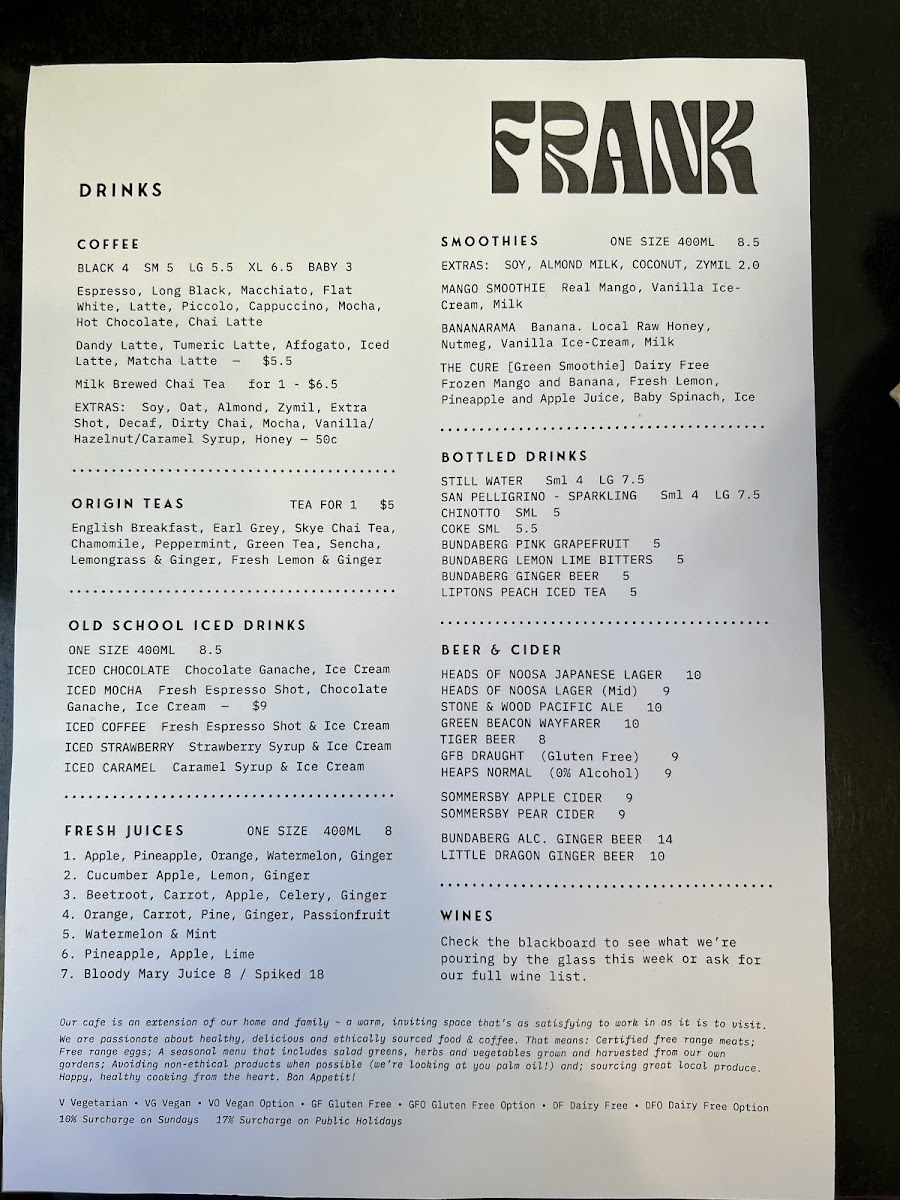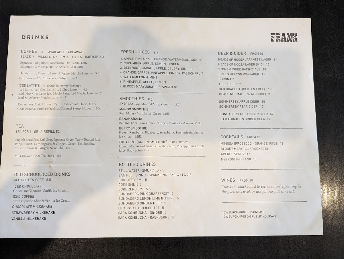 The drinks menu has a great selection of coffee, including Espresso, Macchiato, and Dandy Latte, as well as iced options like the Iced Mocha Latte and Iced Strawberry Matcha Latte. Fresh juices are also available in a variety of refreshing flavors, from Apple and Pineapple to Carrot, Beetroot, and Ginger. Smoothie lovers can enjoy options like the Mango Smoothie or the Bananarama. For something a little stronger, there are cocktails like the Mimosa and Negroni by Frank, as well as a selection of Beers and Ciders.