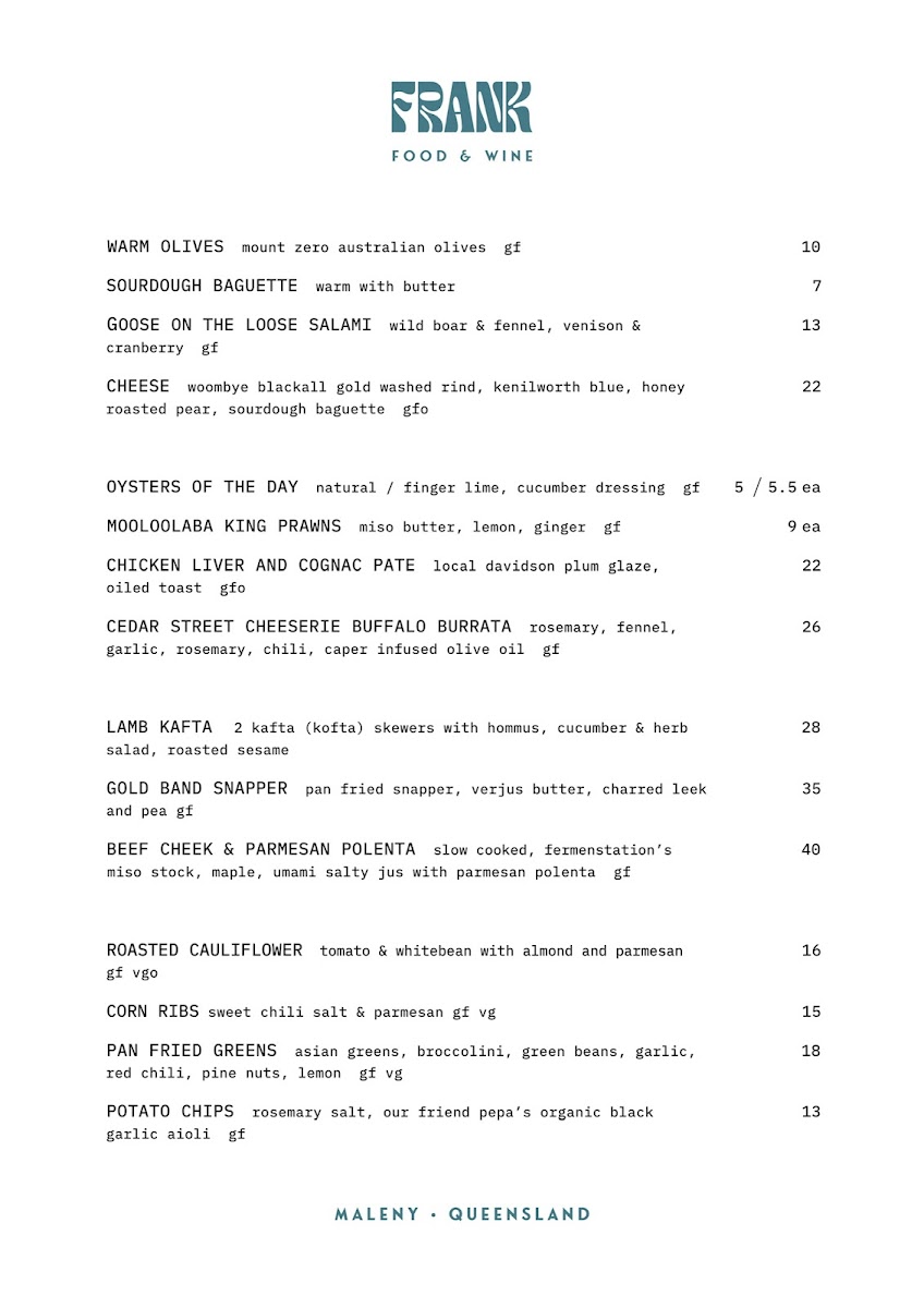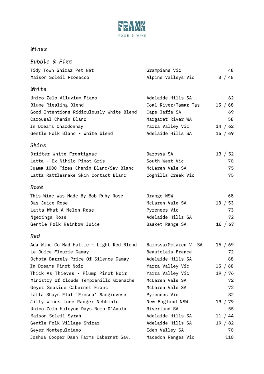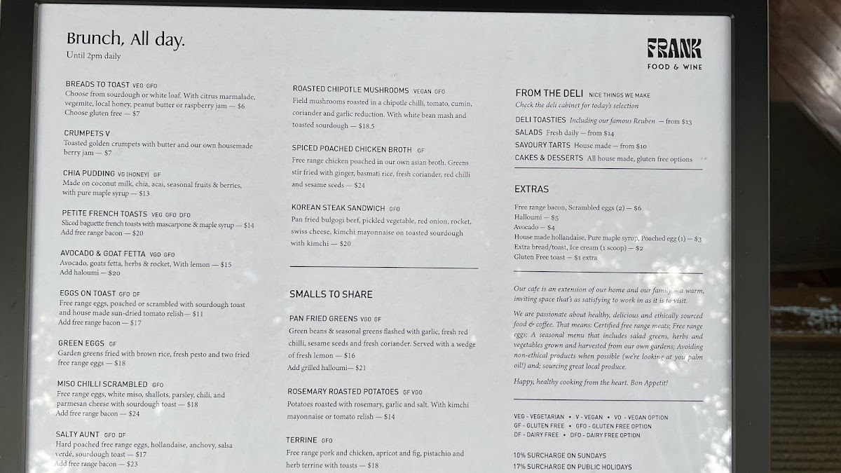Brunch options such as Petite French Toasts and Avocado & Goat Fetta are perfect for a light meal, while Smalls to Share like Pan Fried Greens and Rosemary Roasted Potatoes offer a flavorful bite to complement any dish. If you have a sweet tooth, the menu also includes Cakes & Desserts to end your meal on a high note. Whether you're popping in for a quick coffee or enjoying a long brunch, Frank Food & Wine has something to satisfy every craving.